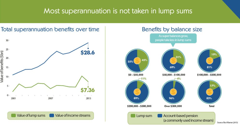 Less than 30 per cent of super assets are taken as lump sums and, when lump sums are taken, they have a relatively small median value of around $20,000, according to Commission estimates based on Australian Bureau of Statistics data from 2011-12.