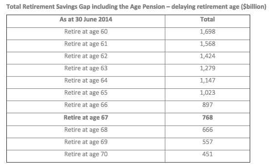 Similarly, the research shows the impact that deferring retirement will have on the size of the gap. Rice Warner applies a retirement age of 67 when measuring the gap. This is higher than the median retirement age for current retirees (about 62), but may be more realistic for younger workers given that workforce participation for older workers is trending upwards.