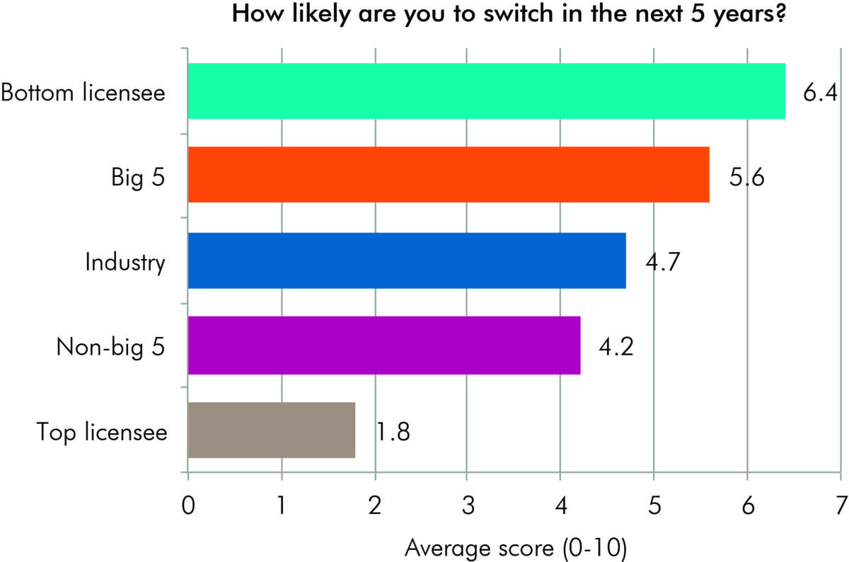But for most of the big licensees and some of the small ones these findings reflect a broader picture among advisers in bank-aligned licensees in that they tend to be less satisfied, be less likely to recommend their licensee and be more likely to switch to a new licensee.