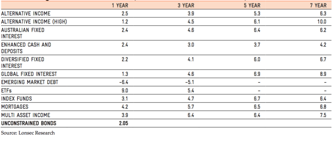 Table 1. Average annual returns after fees (Lonsec fixed interest fund universe)