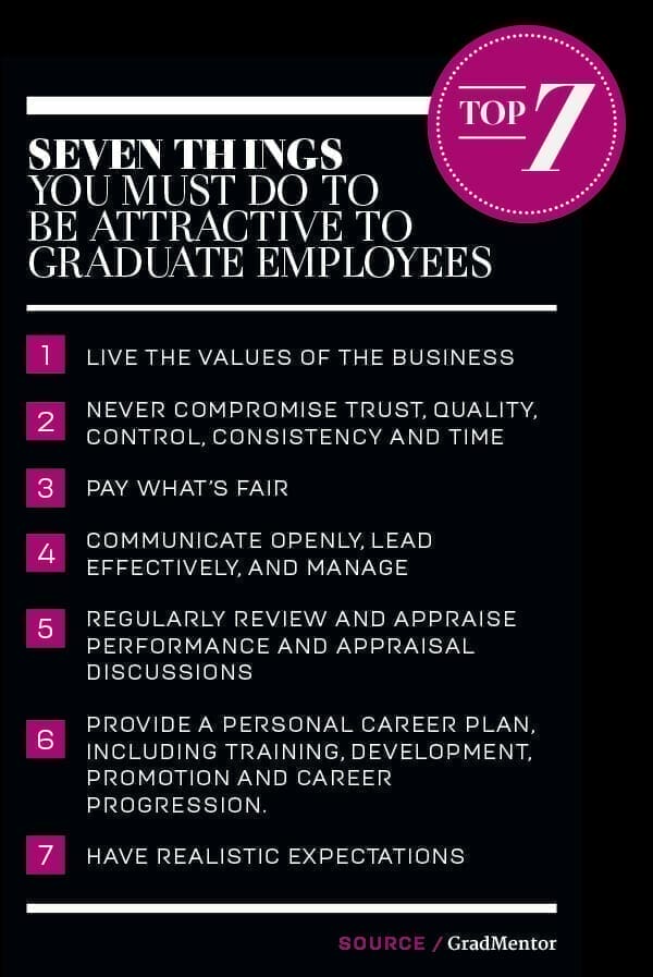 Pay needs to be reasonable, not necessarily top dollar, and certainly not used to build loyalty, Barr says. Formalised communication about performance and expectations are a feature of big businesses but can be applied in small businesses too, Barr says. Graduates do not want to be put on a “set-and-forget” path.