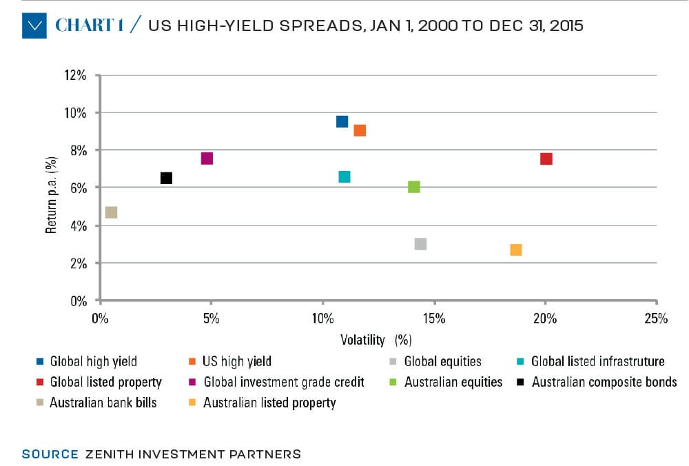 Historically, the global high-yield market has returned 10 per cent per annum with volatility of 11 per cent per annum in Australian dollar terms over the January 1, 2000 to December 31, 2015 period. This compares favourably to other asset classes (see chart 2).