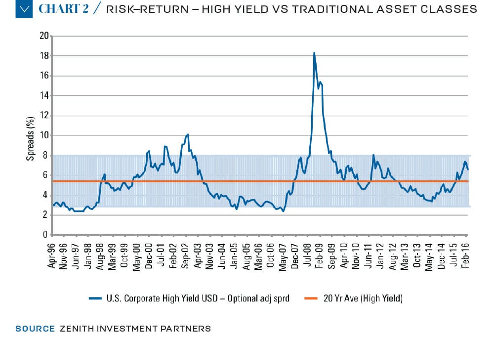 There are no doubt a multitude of such opportunities in current markets. Zenith believes that one such example may be the high-yield fixed income market. For those less familiar with this market, high yield is a generic term used to define bonds that are rated below a specific level by the major credit ratings agencies, such as Standard and Poor’s (S&P) and Moody’s. A bond assigned a rating of below “BBB” by S&P and “Baa” by Moody’s is deemed to be below investment grade, and as such is classified as high yield.