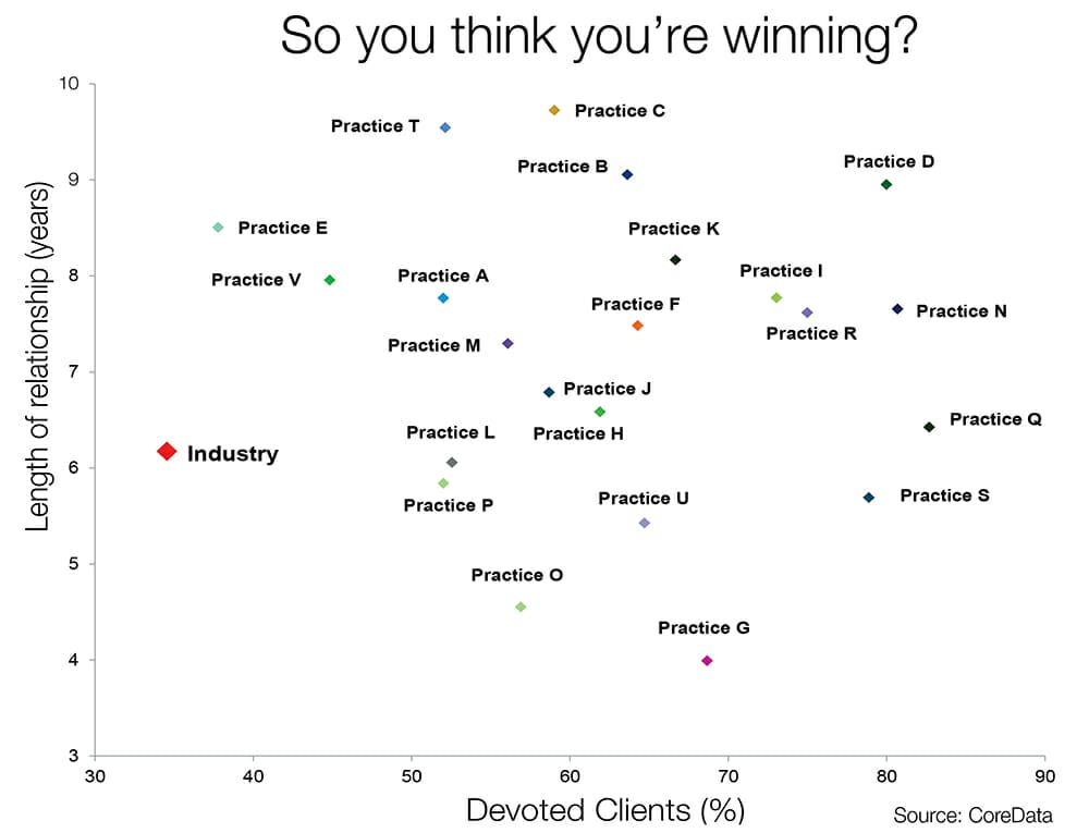 CoreData says that as an industry, financial planning remains “challenged” when it comes to delivering consistent experiences to customers. And there is a low correlation between the length of the relationship and the proportion of devoted clients – which means the experience doesn’t necessarily even improve over time.