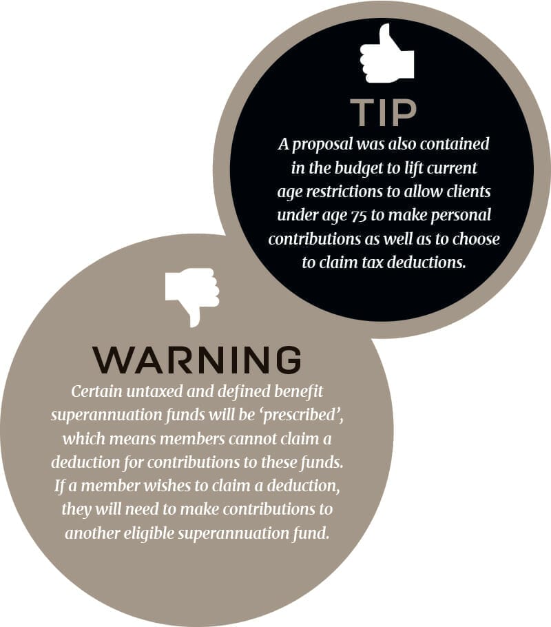 Salary sacrifice will remain an option but the budget proposals will allow everyone under age 75 to make personal contributions and choose to claim a tax deduction, regardless of work status, from July 1, 2017.