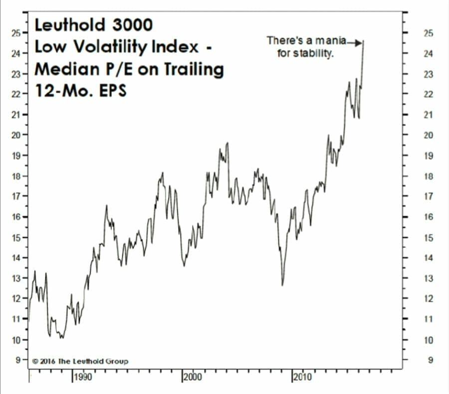 Take the chart below that shows the bubbly median price-to-earnings ratio for the Leuthold 3000 Low Volatility Index. It’s not news that investors are devouring stocks offering stability. You can also see it on a company-by-company basis, or in different industries.