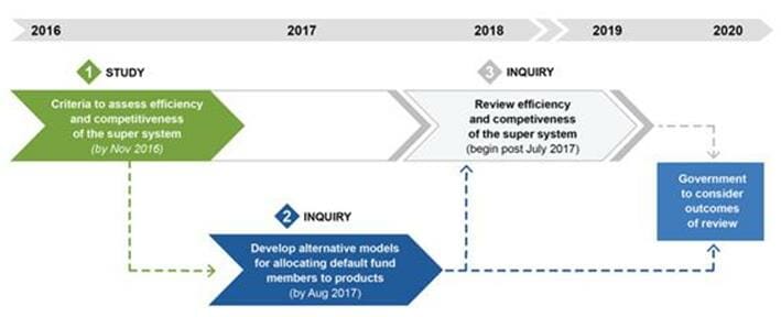 This inquiry represents the second of three related pieces of work to be undertaken by the Productivity Commission (figure 1) stemming from the Australian Government’s response to the recommendations of the 2014 Financial System Inquiry (FSI). The FSI found that the superannuation system was not operationally efficient due to a lack of price‑based competition in the sector. To improve operational efficiency during the accumulation phase of superannuation, the FSI recommended the introduction of ‘a formal competitive process to allocate new default fund members to MySuper products’, unless a review by 2020 finds such a move would be unnecessary (Murray et al. 2014, p. 101).