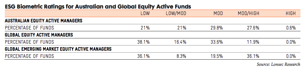 According to Lonsec Research’s newly released Responsible Investment Sector Review, 58% of active Australian equity funds achieved a pass mark (‘moderate’ rating or higher) on an ESG basis, compared to only 46% for developed market active global funds.