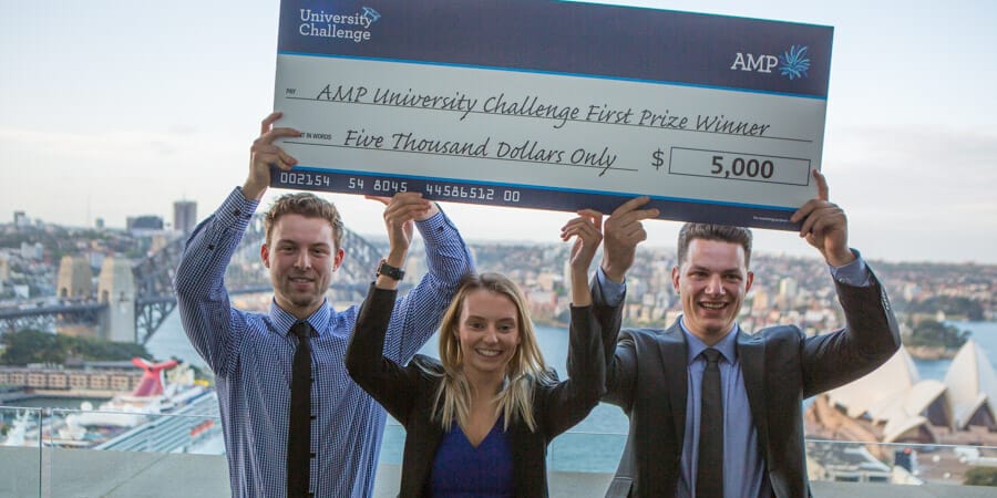 A team representing Deakin University has beaten a high-quality field of finalists in the 2016 AMP University Challenge to claim first place and a prize of $5000, plus textbooks, magazine subscriptions and a student membership each of the Financial Planning Association (FPA).