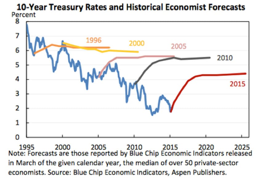 Both the Long Term Interest Rates: A Survey report and Figure 2 reveal that not only are experts poor at predicting long-term rates, they cannot reach a consensus explanation as to why rates have fallen as dramatically as they have.