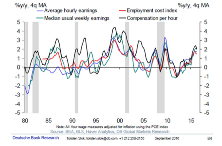 At Montgomery we have previously noted US presidential candidate Hillary Clinton’s desire to raise the minimum wage in the US by close to 70 per cent to over US$12.00. But even in the absence of this increase, Figure 4 reveals labour unit costs are now approaching pre-GFC levels thanks to a tight labour market which can be seen in Figure 5.