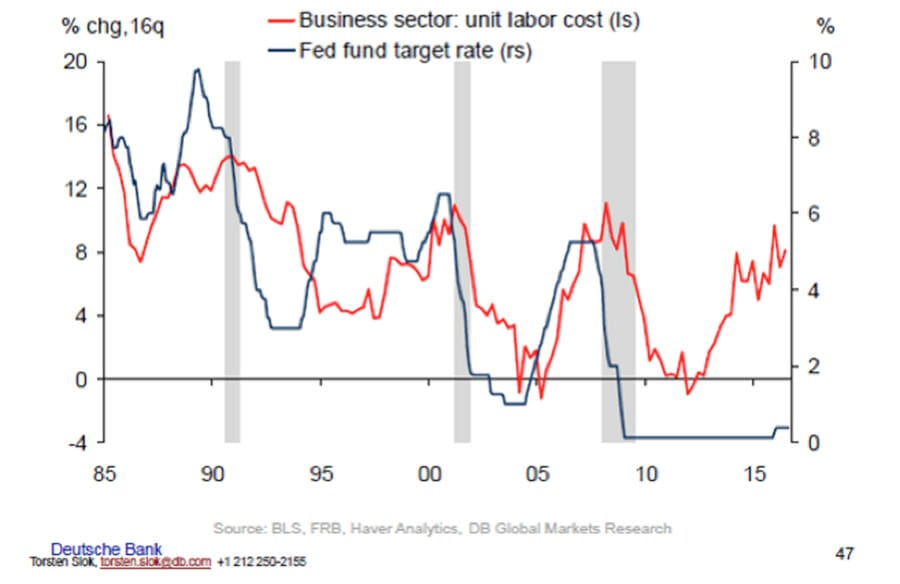 The tightening labour market is seen in the fall in the US jobless rate from 10 per cent to 4.9 per cent. More importantly, according to Sløk, the “number of people available per job opening is below 2007 levels”. As Figure 5 reveals the Fed appears to have embarked on an experiment to hold rates lower than is justified by the cost of labour.