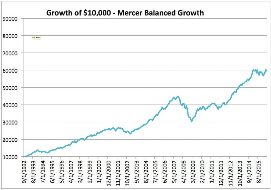 As the graph above illustrates, the volatility of the Mercer Balanced Growth Index fell to around 3 per cent in 2005 and passed 14 per cent in 2008/09; almost double the maximum risk tolerance of the average “balanced” client.