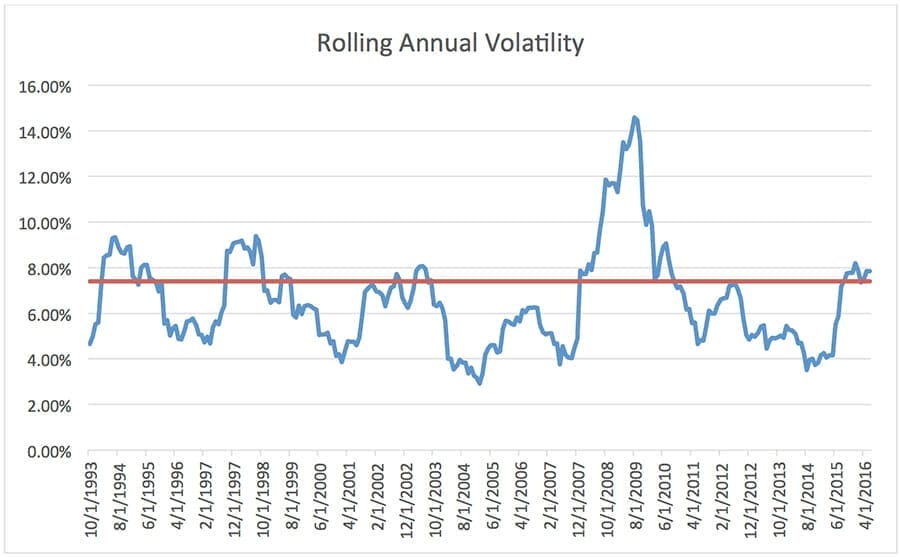 Annualised volatility of 7.5 per cent is roughly the maximum risk a “balanced” client can tolerate, but as can be seen, volatility can vary drastically year-on-year even though it may smooth out over time.
