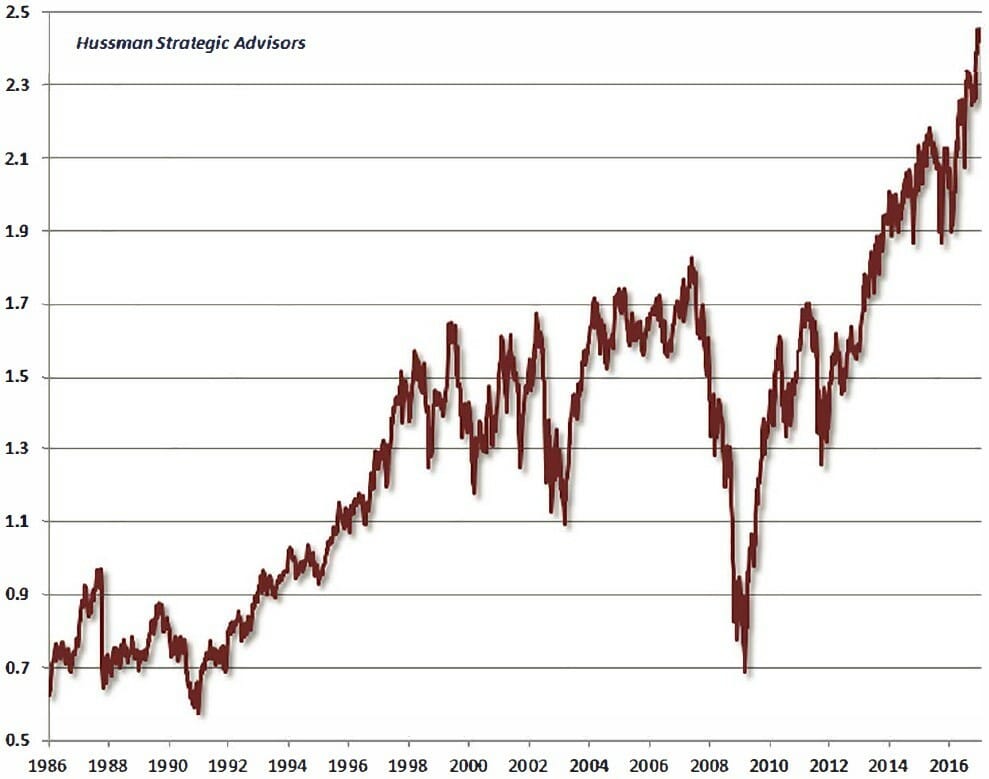 For anyone looking to profit from Trump’s policies, keep in mind that share prices have already moved to factor them in. In fact, we enter 2017 with one of the most expensive US sharemarkets ever. The chart shows the median valuation of the stocks in the S&P 500 measured by the ratio of price to revenue, which aims to slice through the numerous ways earnings can be manipulated.