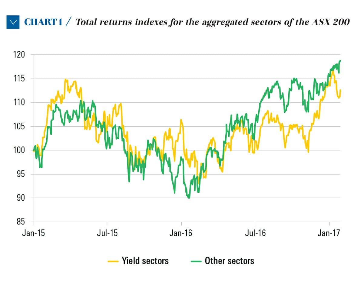 By far the biggest theme in Australian equities over the past few years was the dominance of the total returns that the aggregate of the four high-yield sectors (financials-x-REITS, REITS, telcos and utilities, known as the ‘yield-play’) over the aggregate of the other seven sectors for an extended period – and then its swift demise in 2016.