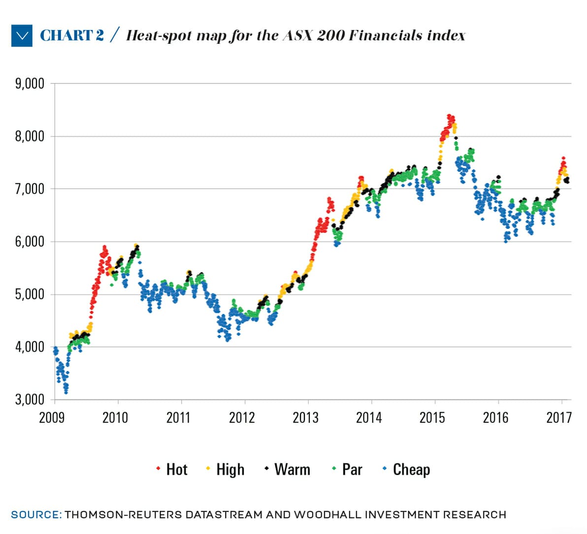 The US financials’ sector was even more heavily overpriced – and it still is. However, the US is facing probable rising interest rates and big changes in regulation. We, at best, are looking at flat rates and no substantive changes in regulation. As we can note from the ‘heat-spot map’ in Chart 2, which is an update of the same chart (and for the same reason) in the Jul ’15 issue, we got ahead of ourselves and so the bubble burst. The red spots show the ‘danger’ region for corrections (> +6 per cent) and we got one – a big one – as we had six times before in the years since the start of the GFC recovery.