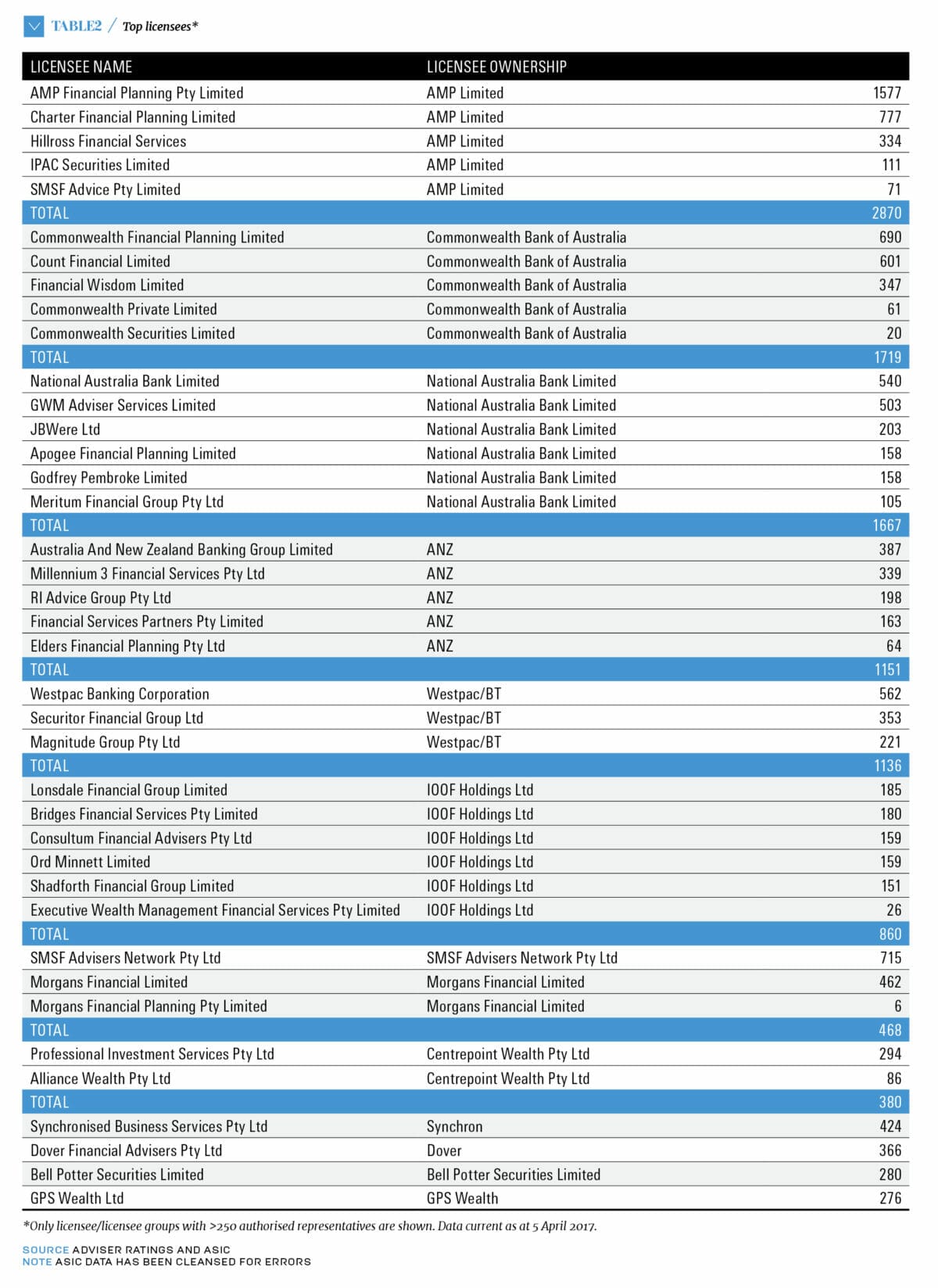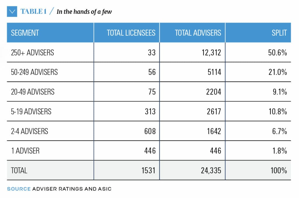 Data provided to Professional Planner by Adviser Ratings shows that as of April 5, 2017, more than half of all advisers on the ASIC financial advisers register were authorised by just 13 groups, controlling 33 licensee entities. Collectively, these groups had 12,312 representatives out of 24,335 on the ASIC register.