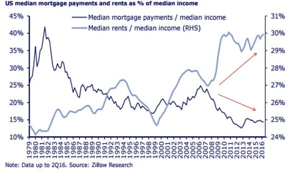 Unlike in Australia, where mortgage repayments are consuming a high proportion of incomes despite pygmy interest rates, in the US it’s much cheaper to buy than rent (on average see Chart 1 below).