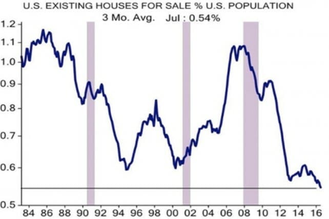 Lastly, the number of US homes available for sale as a percentage of the population is at its lowest level in at least three decades, as Chart 3 shows. Housing starts are running at about 1.1 million, compared with a long-term average of 1.4 million. Given the expected growth in the Millennial population and obsolescence of the existing housing stock, other estimates put the future requirement at 1.6 million. If that’s correct, the current deficit of new homes being built could further stimulate demand over time as the industry plays catch up following the slow recovery since the GFC.