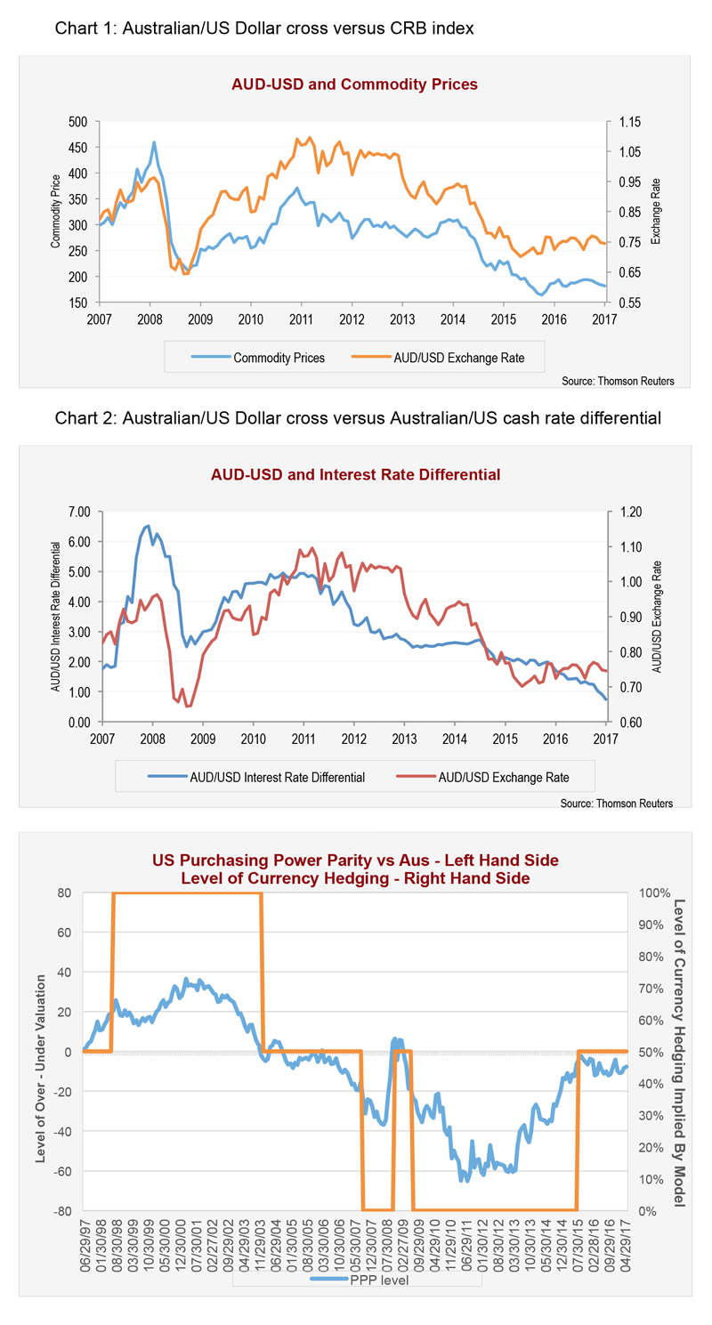 Searching available relevant financial literature reveals that Russell Investments published a research paper in 2013 titled “A forward-looking approach to strategic currency hedging”. The paper was written from a Canadian investors’ perspective, focusing on PPP to determine an optimal hedging ratio for this investor. The paper concluded that superior outcomes were achieved, from a risk/return perspective, through a dynamic hedging approach based on PPP. However, as noted in the paper, since the Canadian dollar and Australian Dollar are both commodity currencies, there is a question of whether this research is equally applicable to Australian investors.