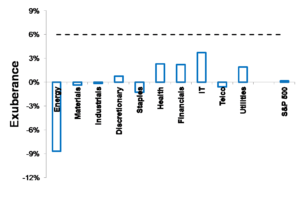 Since 2005 I have been calculating a measure of mispricing, called exuberance, for the ASX 200 and its 11 sectors. In 2010 I expanded the list to include the S&P 500 and its 10 sectors. The basis of all of the mispricing signals is to compare actual growth in the indices to my forecasts based in turn on broker forecasts of dividends and earnings. If actual growth is running faster than projections, the index is growing over-priced and vice versa.