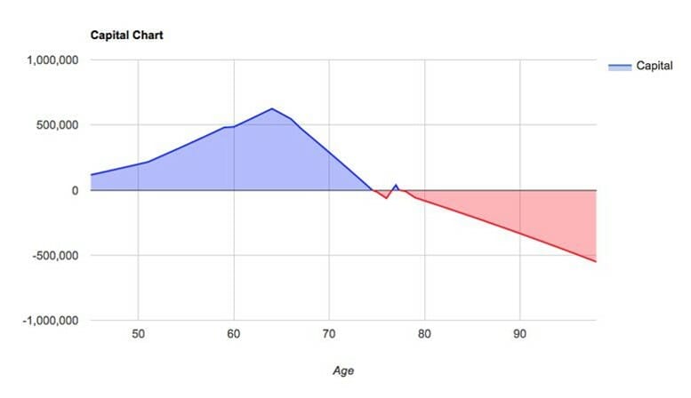 Unlike table 1 above, table 2 shows based on prudent assumptions, our client will pass away with too much money, whereas they could have done more such as travelled business class, helped the kids with home deposits etc, whatever was important to them. The modelling empowers them to see this.