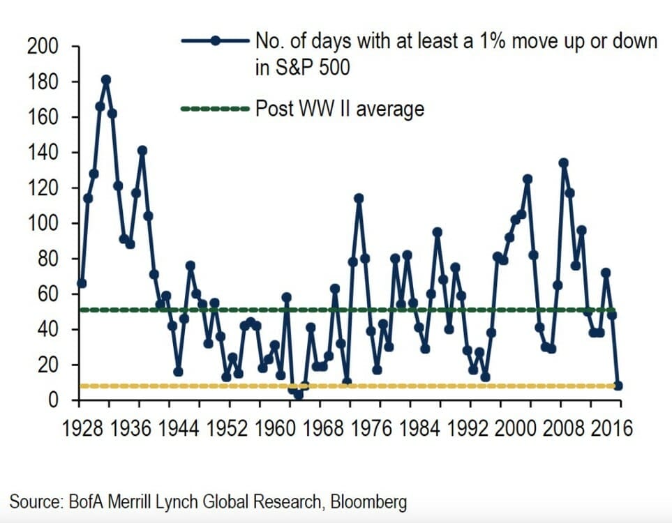 As Chart 1 and Chart 2 reveal, since October 2016, the S&P 500 has displayed only one-way traffic. The index rises interminably and volatility continues to decline, and that’s despite fake news at Facebook, the incineration of cash at Tesla, Russian interference in US elections, Chinese debt issues, the threat of nuclear attack and even missiles flying over Japan. Every day, the market just keeps going up.