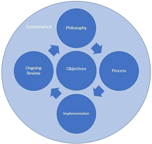 Chart 1 (below) shows one version of the structure of an IPS. Central to it are the objectives, with surrounding components designed to maximise the achievement of those objectives. Namely, philosophy, process, implementation and the ongoing review. Also, covering all aspects of the IPS is a system of governance focused on execution and accountability of all policies. Here are brief – not comprehensive – descriptions of each of these components.