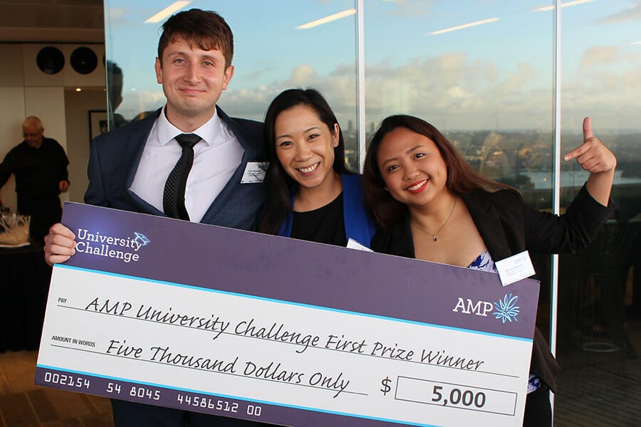 - Second place: Sequoia Advisory (University of Queensland) Team: Angus Kizil, Patrick Egstorf and Sean McBurnie. Coach: Clint Adams, AMP planner development coach.
