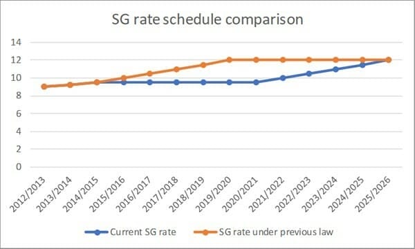 The SG rate was legislated by the previous Labor government to increase over from 9 per cent to 12 per cent over seven years, starting in 2013. But it stalled at 9.5 per cent in 2014 under the Liberal Government. It was then frozen for three years as part of the May 2014 federal budget. Late last year, the scheduled start date for SG rate increases was pushed back to 2021, meaning the rate will not reach 12 per cent until the start of the 2025-26 financial year – seven years after the originally scheduled date.