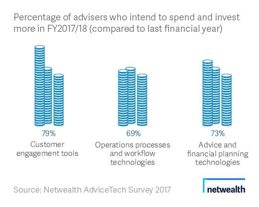 This view is supported by data in Netwealth’s 2017 AdviceTech report (see chart), which shows the vast majority of advisers are willing to invest more in their relationship with technology than they have in the past.