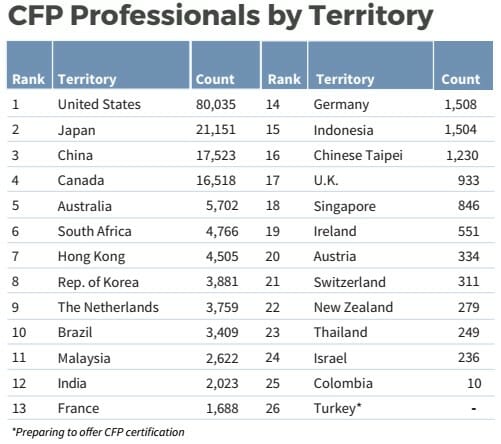 Aside from the US, Japan and Australia are two of the more subscribed nations, per capita. The Japan Association for Financial Planners introduced the CFP certification program after signing an affiliation with the Certified Financial Planner Board of Standards in 1992, whilst the Financial Planning Association leads the program in Australia.