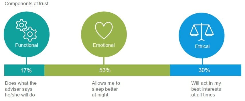 Developing this kind of trust, Kinniry explains, is a multifaceted process involving functional, emotional and ethical factors, but not in equal measures; tapping into the emotional needs of clients dominates the process, and is a major part of an adviser’s journey up the value chain.