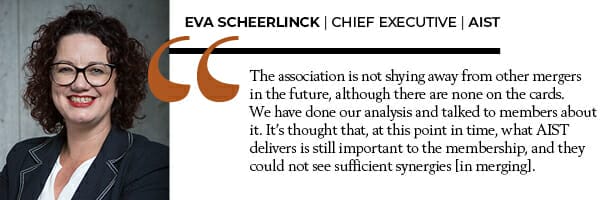 “We have done our analysis and talked to members about it,” Scheerlinck says. “It’s thought that, at this point in time, what AIST delivers is still important to the membership, and they could not see sufficient synergies [in merging].”