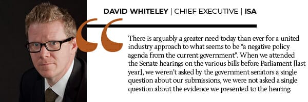 ISA chief executive David Whiteley says there is arguably a greater need today than ever for a united industry approach to what seems to be “a negative policy agenda from the current government”.