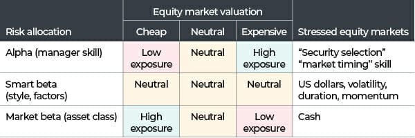 • Increased allocation to beta-focused strategies (i.e. index or benchmark-hugging strategies) when equity markets are cheap.