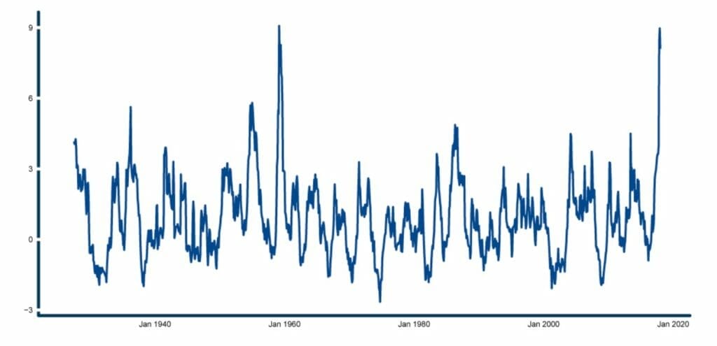 Figure 4 shows the 12-month annualised Sharpe Ratio and reveals that the recent extreme version of high returns combined with low volatility in the S&P 500 is an anomaly that has been seen only once previously, in the 1950s. In any event, the chart shows that a combination of higher volatility and lower returns is more normal and is likely to return.