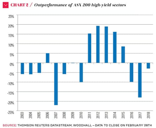 But where will the growth come from on the ASX 200 in 2018? I’ve updated some figures I used a few times a couple of years ago in Chart 2. There are four high-yield sectors (Financials, Property, Telcos and Utilities) and seven other sectors. The bars in Chart 2 show the differences between the total returns of the high-yield sectors and those from the other sectors.