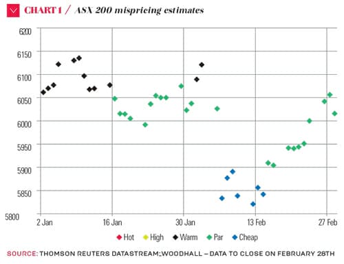 The S&P 500 fell by 10 per cent in a few days but it rallied hard to claw back most of that loss. Since the ASX 200 was not overpriced – at least by our measures – it fell by only 5 per cent. I show the ASX 200 for January and February in Chart 1. The colour coding relates to the mispricing (exuberance) discussed last month. Red (hot) would denote a correction of 6 per cent to 10 per cent or a prolonged sideways movement is expected. Yellow (high) would be just under that mispricing. However, black (warm) was the hottest it got in January.