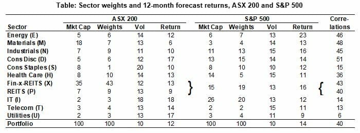 Table: Sector weights and 12-month forecast returns, ASX 200 and S&P 500