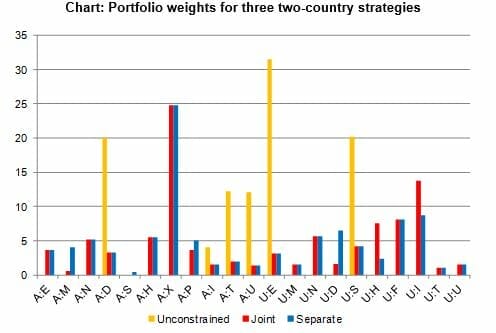 Chart: Portfolio weights for three two-country strategies