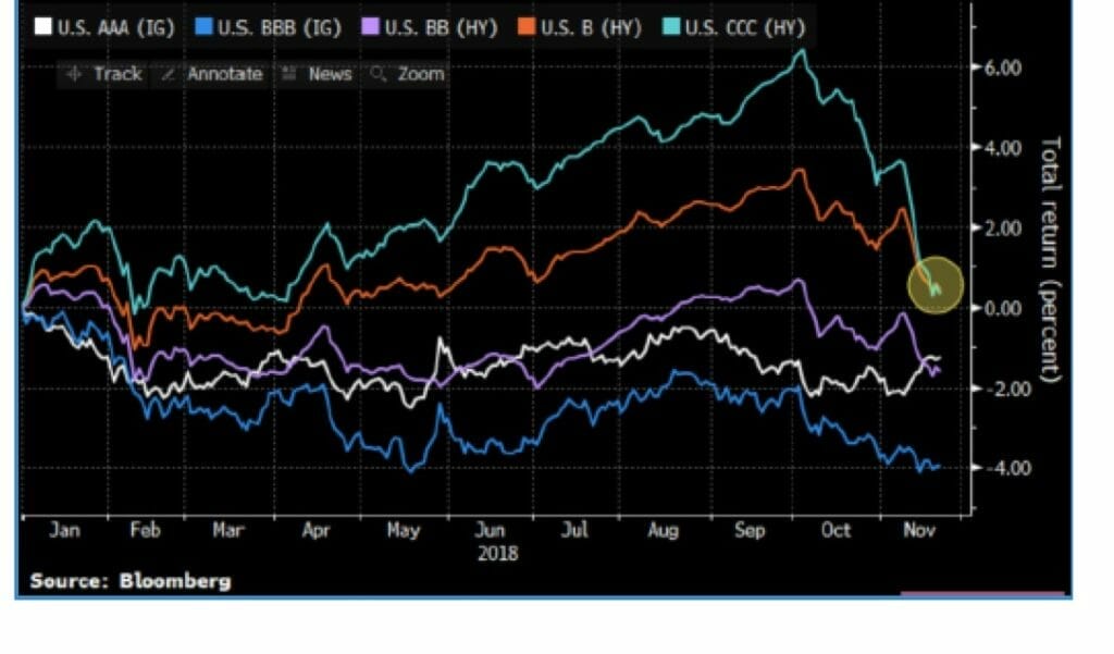 Of course, when Treasury bond prices fall, and their rates start rising, those Treasuries start looking more attractive than corporate bonds. And given a record 47 per cent of all US corporate bonds are rated the lowest investment grade, BBB, and a record amount of CCC-rated bonds are due for refinancing in 2019, it’s probably no surprise that investors want out of the weakest-credit corporate bonds.