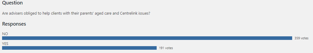 The poll, which asked whether advisers were obliged to help clients with their parents’ “aged care and Centrelink issues”, received a 65 per cent no vote.