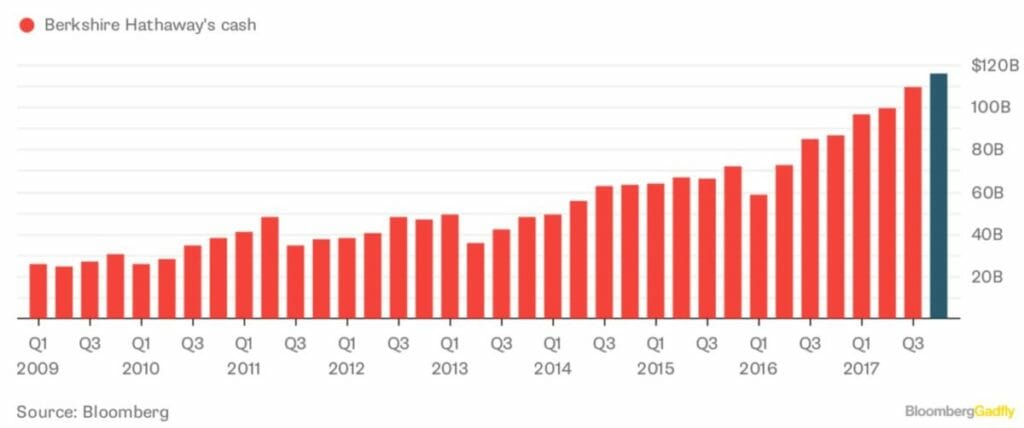 This Bloomberg chart shows cash at Warren Buffett’s Berkshire Hathaway was at a record high in 2018 and must now be approaching US$135 billion ($189 billion). That cash balance represents about 27 per cent of Berkshire’s market capitalisation but because Berkshire trades at a premium to its book value, the cash balance is about 34 per cent of the company’s book value. It is Buffett’s biggest portfolio position.