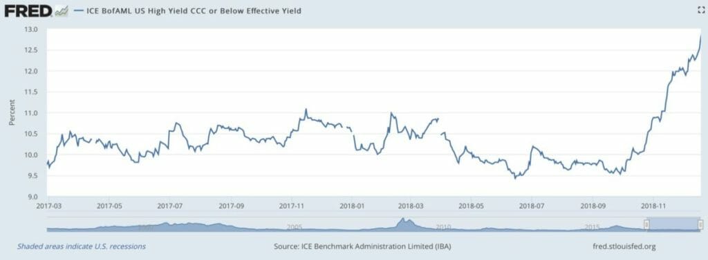 There’s also the record level of CCC-rated bonds due to be refinanced, which we have been alerting investors to since April 2016. From September through December 2018, the BofAML US High Yield CCC or Below Effective Yield has risen from 9.57 per cent to 12.37 per cent, as Chart 3 shows.