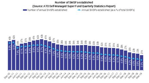 Vanguard, in conjunction with researcher Investment Trends, released a report last week showing that SMSF set-ups haves declined from a peak of 43,000 in the December quarter of 2012 to 21,000 in the first quarter of 2019. The report relied on data from the Australian Tax Office.
