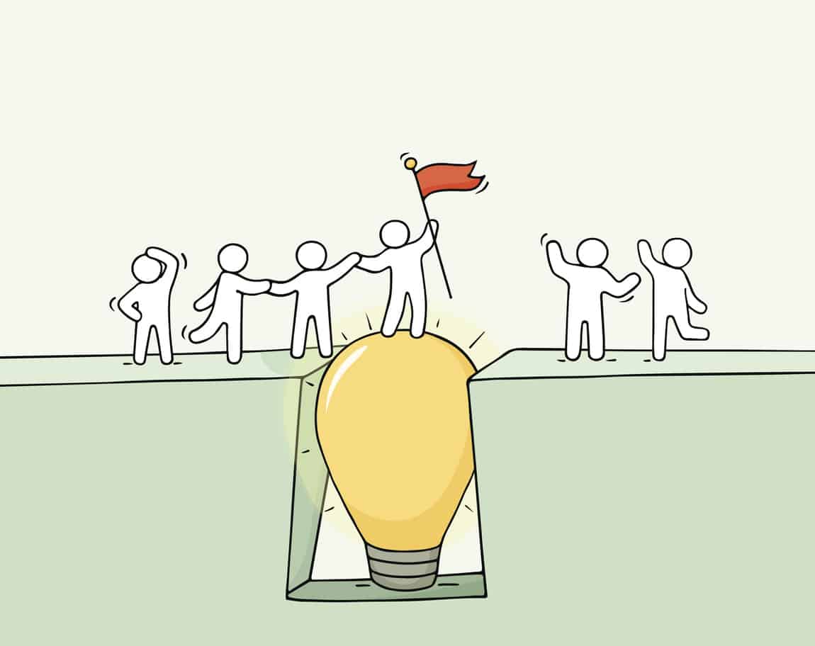 Cartoon working little people cross the abyss. Doodle cute miniature scene of team on the bridge like lamp idea. Hand drawn vector illustration for business design and infographic.