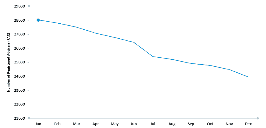 New education, professional and ethical standards were widely tipped to be a factor behind advisers leaving the industry. So the logic went, a cohort of advisers would find the task of upgrading qualifications unpalatable, impossible or impractical. A benchmark of sorts exists in the UK, where an estimated 20 per cent of advisers left the industry after the Retail Distribution (RDR) regulatory overhaul. CoreData’s analysis of the Australian Securities and Investments Commission’s financial adviser register suggests that in 2019 about 15 per cent of advisers – that’s around 4200 individuals, a rate of around 350 a month – have left the industry. We believe this trend is likely to continue into 2020.
