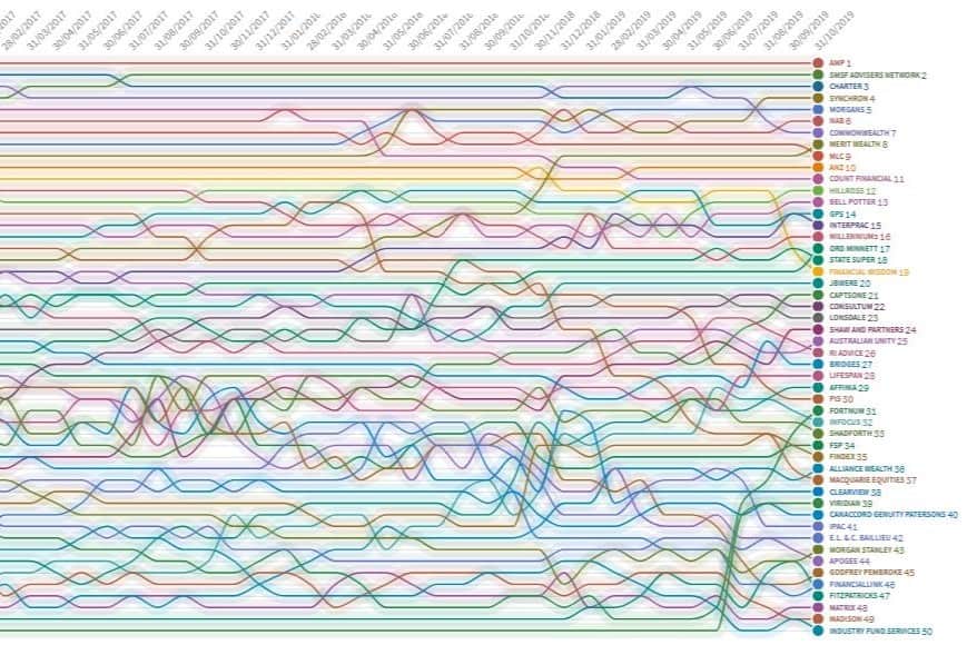Advisers are not only leaving the industry, they’re also moving between licensees. CoreData’s “lap chart” analysis of the 50 largest licensees (as at October this year) shows the rankings of these licensees (based on number of authorised representatives) has been reshuffled considerably since 2016. The biggest players three years ago remain the largest players today but there has been significant action among the smaller licensees where adviser movements and departures have led to a change in the pecking order.